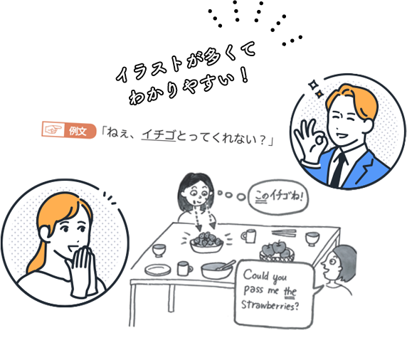 全編を通して楽しいイラストや例を織り交ぜながら解説していますが、ネイティブとの冠詞の失敗例など実体験を通したコラムでブレイクを入れながら楽しく学びます。